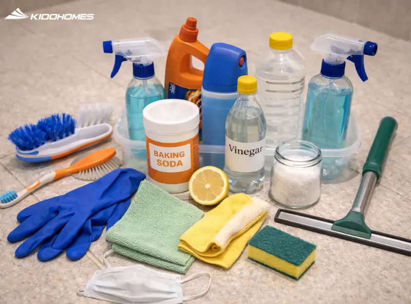 • Dụng cụ: Bàn chải đánh răng cũ (vệ sinh khe hẹp), bàn chải sàn chuyên dụng, cây lau kính, khăn microfiber (không để lại sợi vải), miếng bọt biển.