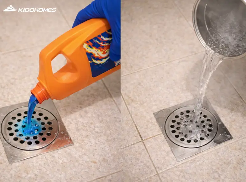 Cuối cùng, hãy đổ một ít nước thông cống chuyên dụng hoặc hỗn hợp muối và nước sôi xuống đường thoát sàn để đảm bảo không có mùi hôi bốc lên trong những ngày Tết.