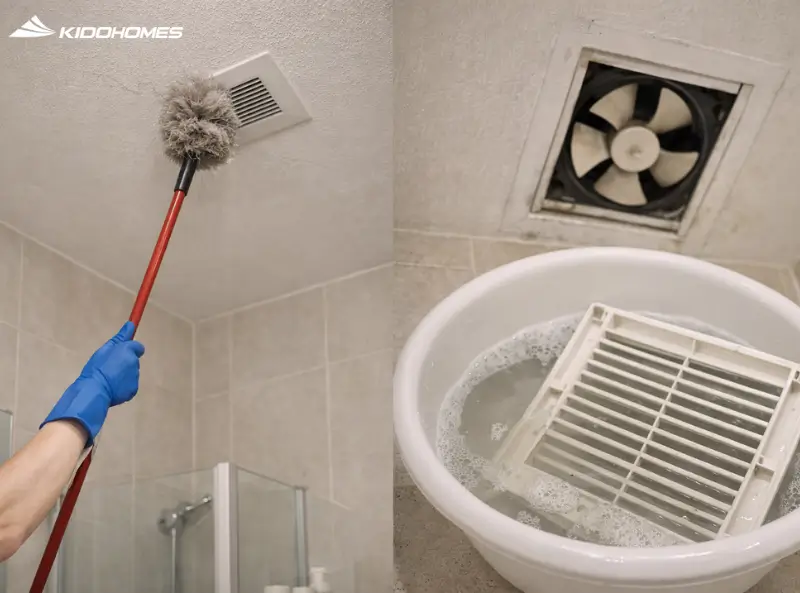 • Tháo nắp quạt thông gió, ngâm vào nước xà phòng ấm và lau sạch cánh quạt. Một chiếc quạt sạch sẽ giúp phòng tắm luôn khô ráo, tránh mùi ẩm mốc đặc trưng.