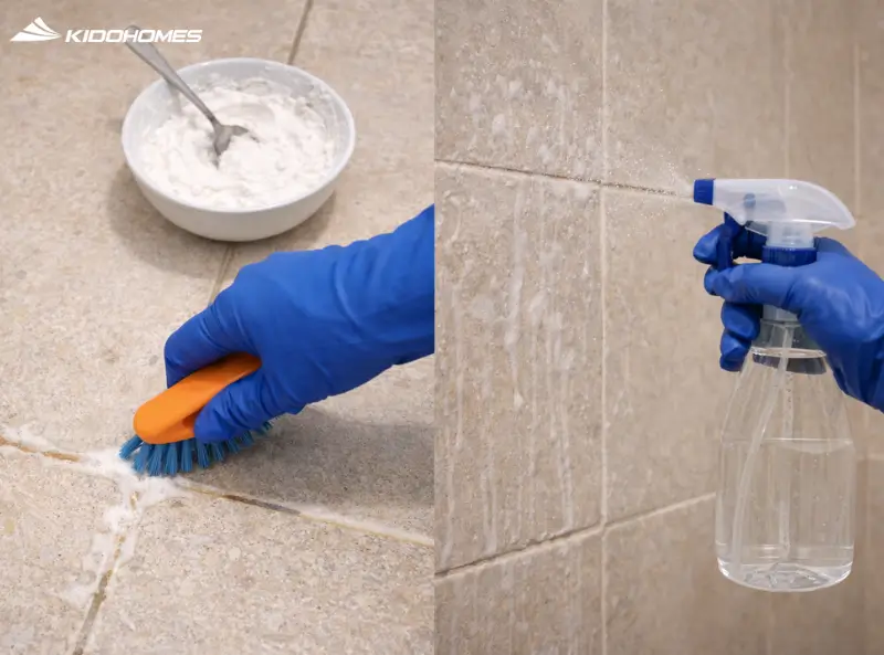 • Mẹo nhỏ: Trộn baking soda với nước thành hỗn hợp sệt, bôi lên kẽ gạch và để yên trong 15 phút. Sau đó dùng bàn chải chà nhẹ, các vết ố sẽ biến mất.