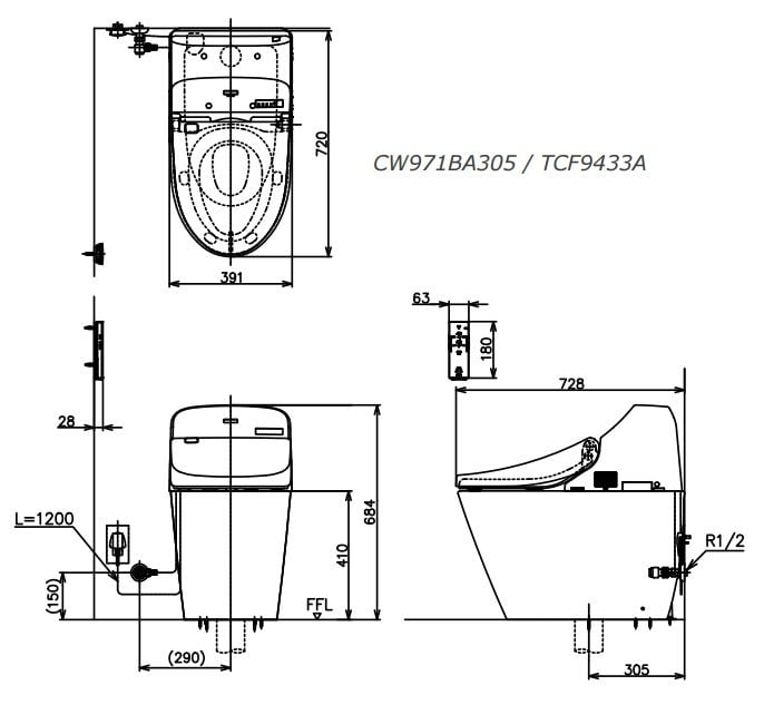 Bản vẽ kỹ thuật Bồn cầu Toto C971/TCF9433A