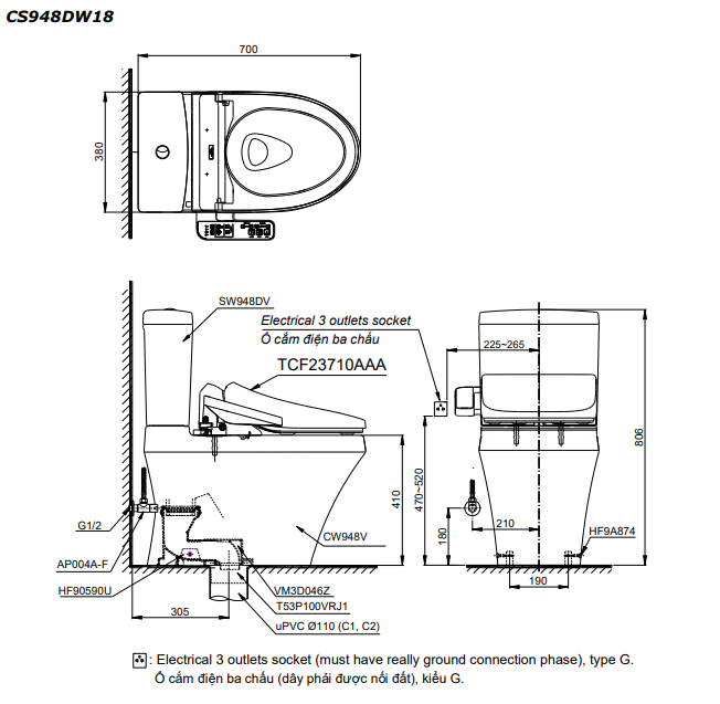Bàn Cầu Hai Khối TOTO Kèm Nắp Rửa Điện Tử CS948DW18#XW