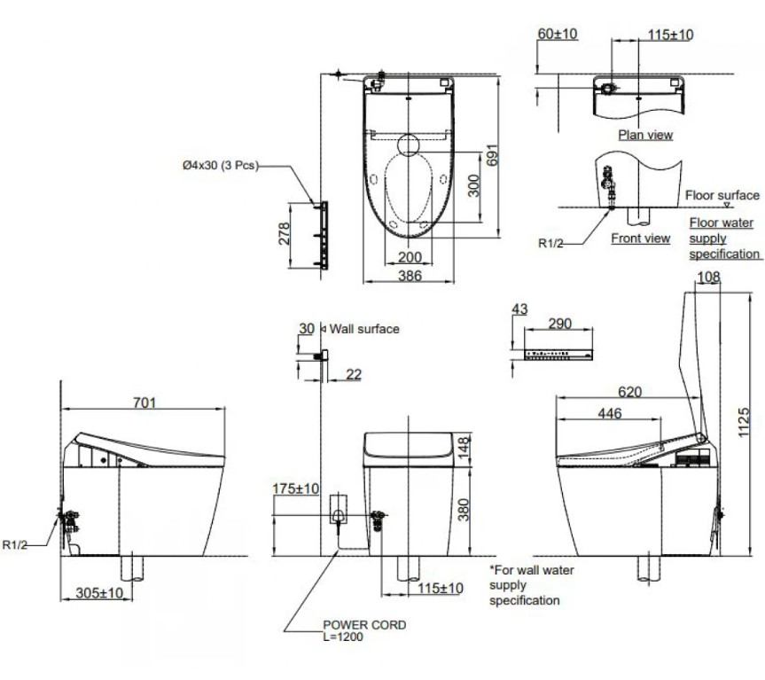 Thông số kỹ thuật của bàn cầu thông minh TOTO NEOREST AH CS989VT#NW1/TCF9788WZ#NW1/T53P100VR