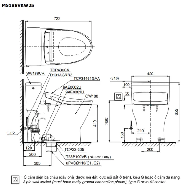 Bản vẽ kỹ thuật của bàn cầu thông minh TOTO MS889CDRW25#XW