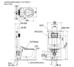 Bản vẽ kỹ thuật bàn cầu treo tường kèm nắp rửa điện tử WASHLET seri RX CW542HME5UNW1-TCF794CZ-WH172AT