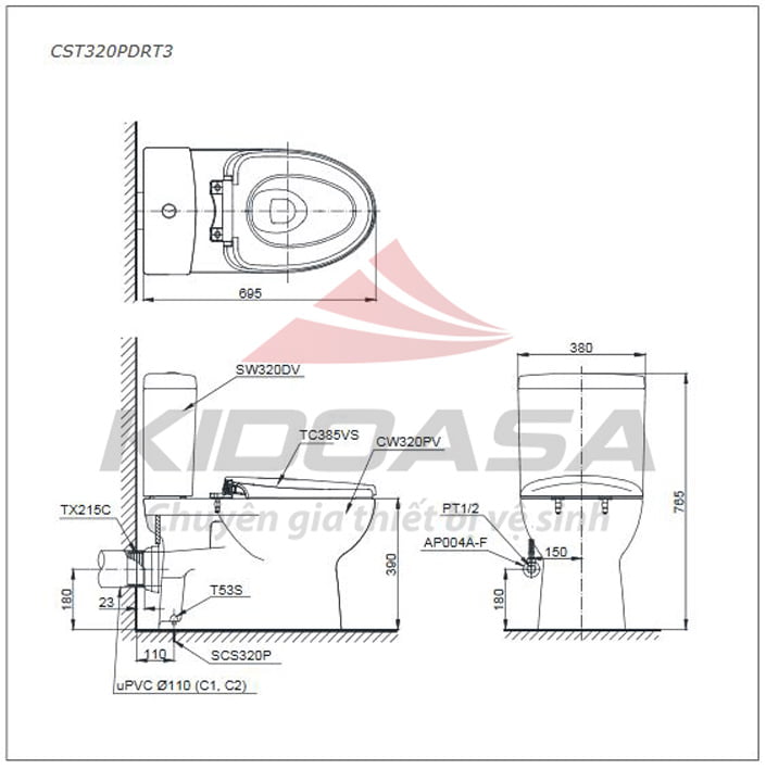 Bản vẽ kĩ thuật của Bồn cầu TOTO CS320PDRT2