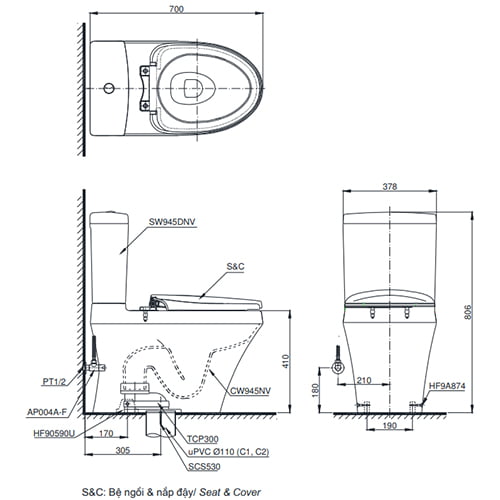 Thông số kỹ thuật của bồn cầu TOTO C948DT8