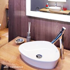 - Chậu được thiết kế đặt bàn kết hợp với vòi cao lắp trên bàn đá hoặc vòi âm tường mang đến sự hiện đại, thẩm mỹ.