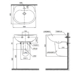 Bản vẽ kỹ thuật của chậu lavabo chân lửng treo tường LHT236C