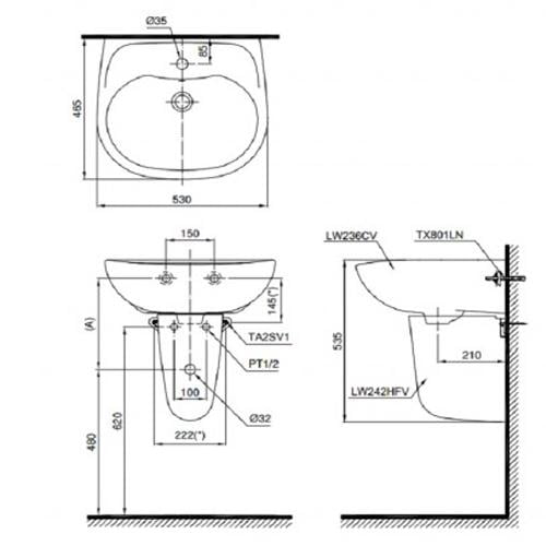Thông số kỹ thuật của chậu lavabo chân lửng treo tường LHT236C
