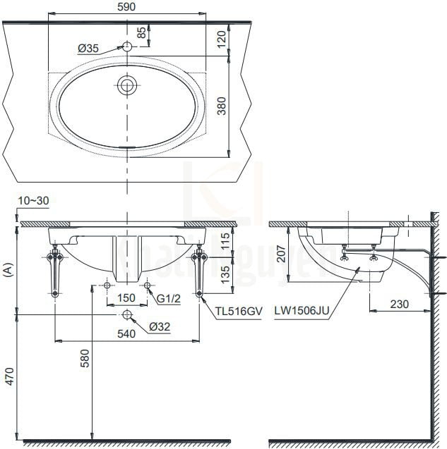 Bản vẽ kỹ thuật chậu rửa mặt TOTO LW1506V/TL516G
