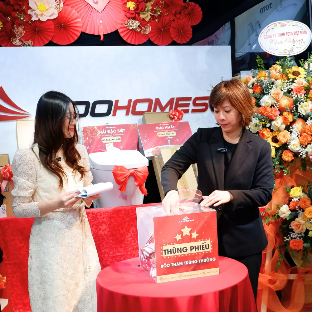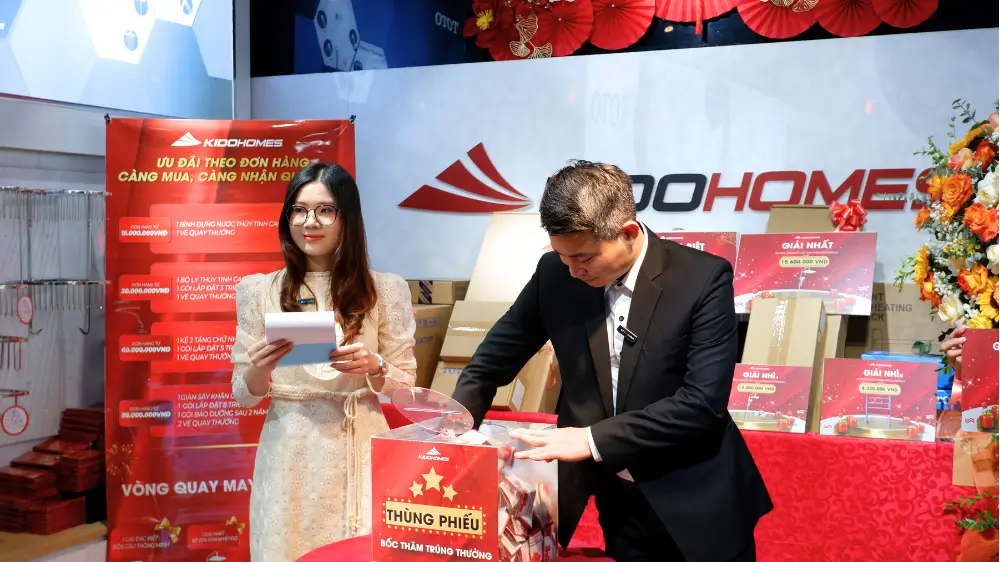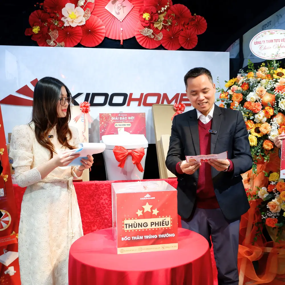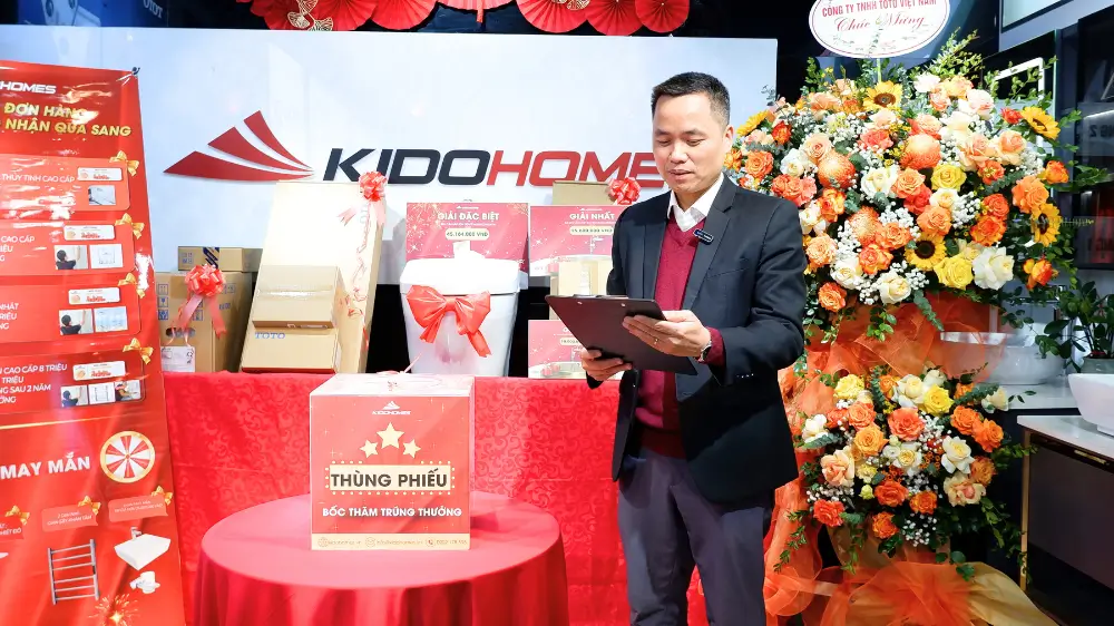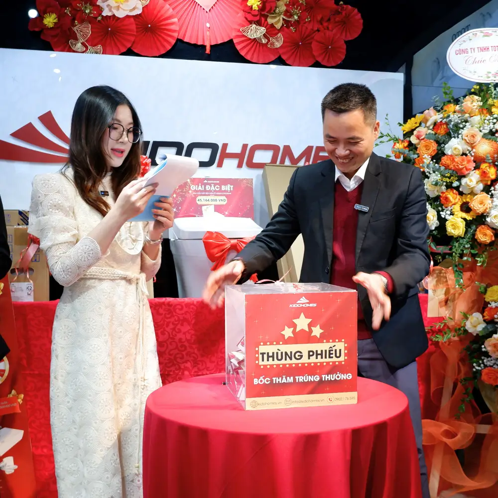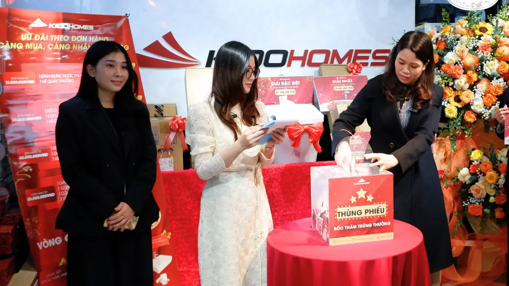 Lễ bốc thăm trúng thưởng của chương trình đã được tổ chức trang trọng tại showroom KIDOHOMES trong không khí ấm cúng, sôi nổi và đầy hứng khởi. Sự hồi hộp xen lẫn niềm vui của khách hàng tham dự đã tạo nên những khoảnh khắc đáng nhớ, góp phần làm nên thành công trọn vẹn cho sự kiện.