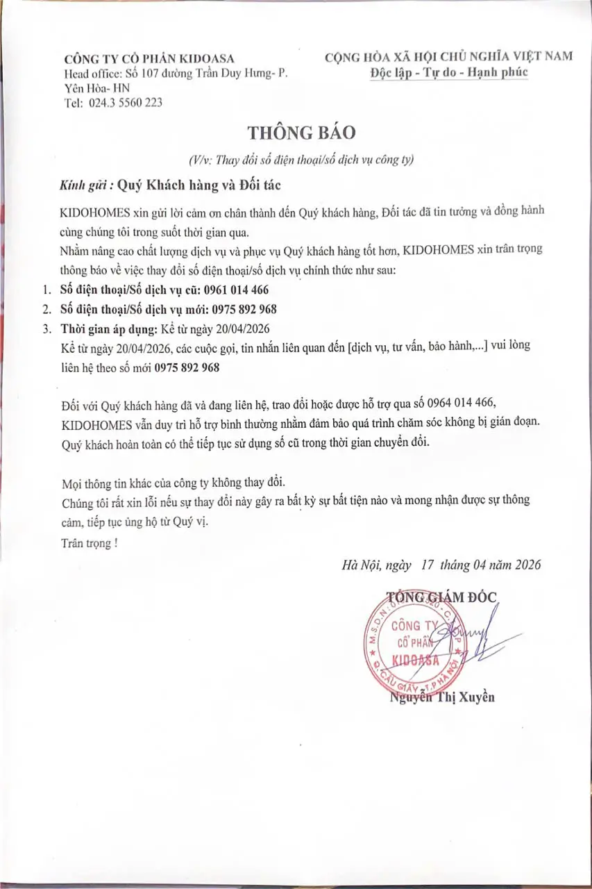 Nhằm nâng cao chất lượng dịch vụ và tối ưu trải nghiệm khách hàng trong toàn bộ hành trình trước – trong – sau bán hàng, KIDOHOMES trân trọng thông báo về việc thay đổi số điện thoại Chăm sóc Khách hàng & Dịch vụ, chính thức áp dụng từ ngày 20/04/2026.