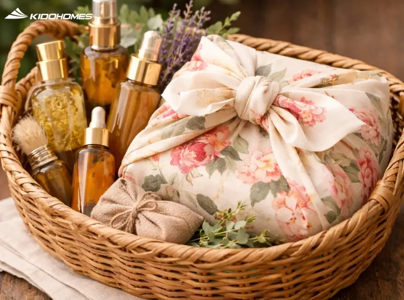• Khăn vải Furoshiki (kiểu Nhật): Dùng một tấm vải lụa đẹp gói bộ sản phẩm lại. Tấm vải này sau đó gia chủ có thể dùng làm khăn trải bàn hoặc khăn trang trí. Điều này nâng tầm món quà lên rất nhiều.