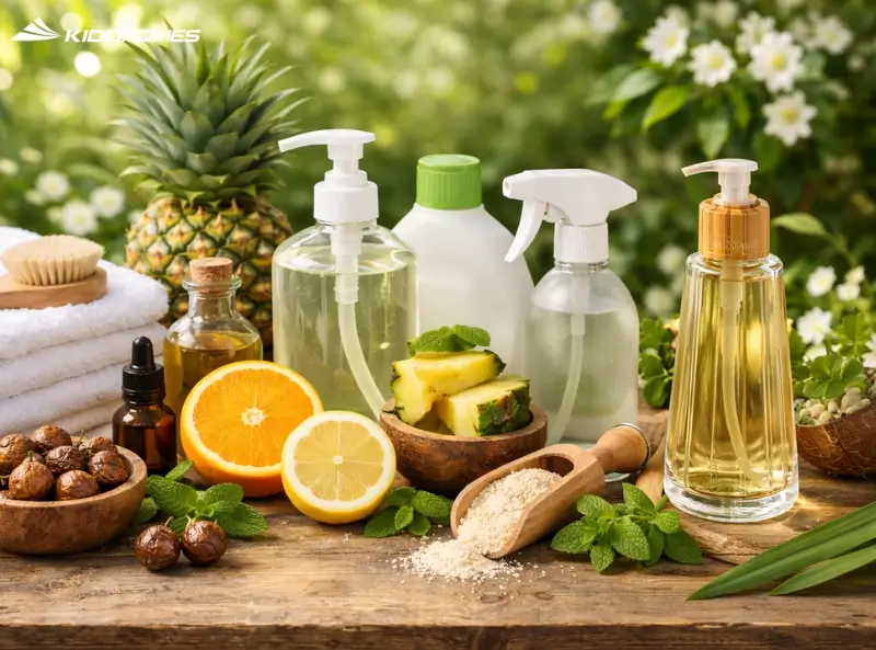 • Tìm các nhãn mác có chữ “Enzyme”, “Bio-based”, hoặc “Essential Oils”. Những sản phẩm này sử dụng sức mạnh từ thiên nhiên (như vỏ dứa, bồ hòn, cam chanh) để làm sạch. Mùi hương của chúng rất thanh khiết, tạo cảm giác thư giãn như ở Spa thay vì mùi hăng hắc của chất tẩy.