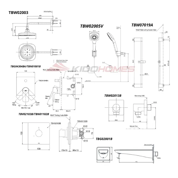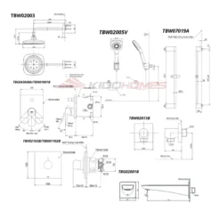 Bản vẽ kỹ thuật của bộ sen tắm âm tường TOTO TBG04304BA/TBN01001B/TBV02103B/TBN01102B/TBW02013B/TBW02003A/TBW02005V/TBW07019A/TBG02001B