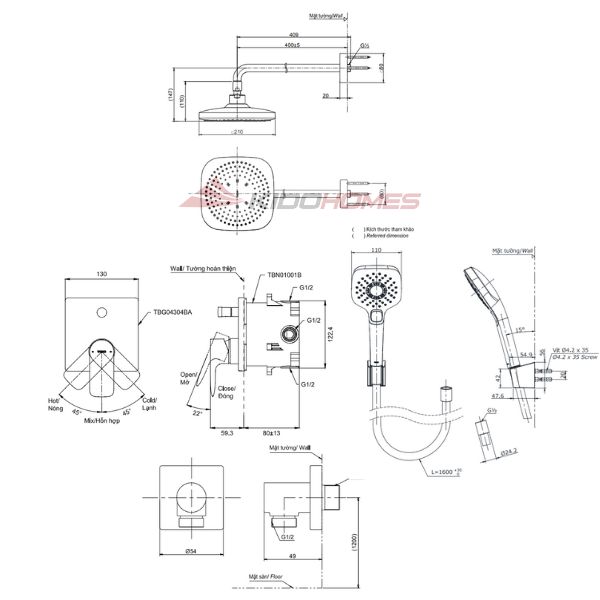Bản vẽ kỹ thuật của bộ sen tắm cao cấp TOTO TBG04304BA/TBN01001B/TBW02003A/TBW02013B/TBW02006V