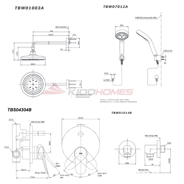 Bản vẽ kỹ thuật của bộ sen tắm âm tường TOTO TBS04304B/TBW01014/TBW01003A/TBW07012A