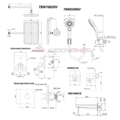 Bản vẽ kỹ thuật của bộ sen tắm âm tường TOTO TBG04304BA/TBN01001B/TBV02103B/TBN01102B/TBW02013B/TBW10020V/TBW02006V/TBG10001B