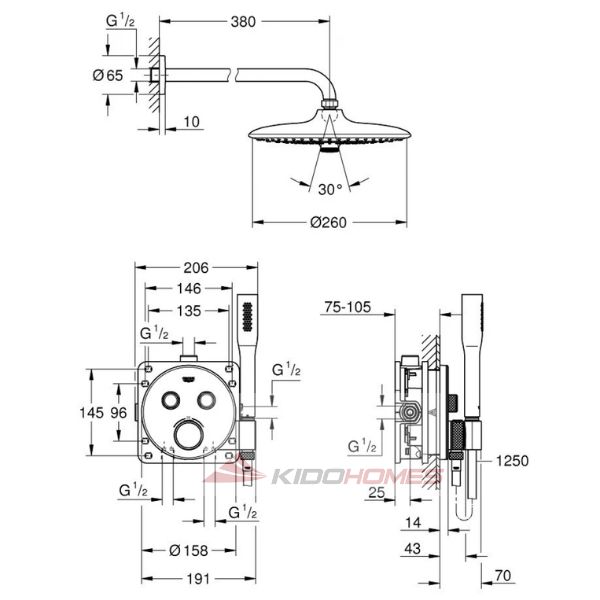 Bản vẽ kỹ thuật của bộ sen âm tường ổn nhiệt SmartControl với bát sen Euphoria 260 GROHE 34744000