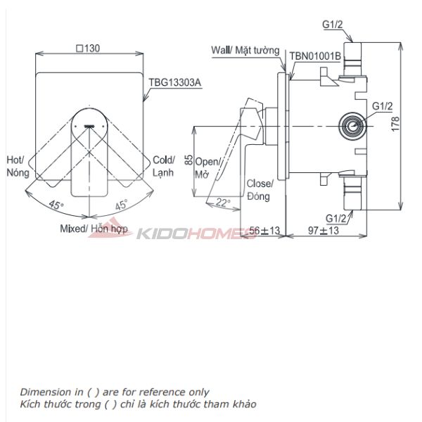 Bản vẽ kỹ thuật của van sen vòi nóng lạnh âm tường TOTO TBG13303A/TBN01001B dòng GT