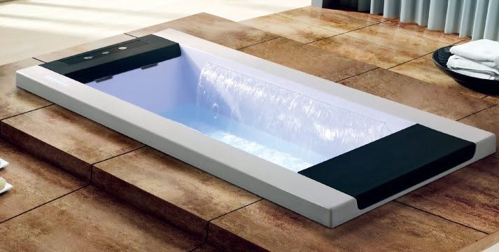 - Vòi sen và các nút điều chỉnh được thiết kế ẩn dưới thành bồn tắm. Bình thường, chúng ta sẽ thấy bồn tắm như một khối hộp vuông vắn, không có điểm lồi. 2 nút điều chỉnh và vòi sen được ẩn đi, bên ngoài còn có 1 đường viền ánh sáng xanh đẹp mắt. Chỉ khi nào chúng ta cần sử dụng thì chạm nhẹ ở bảng điều khiển, vòi sen và các nút điều chỉnh tự động nổi lên.