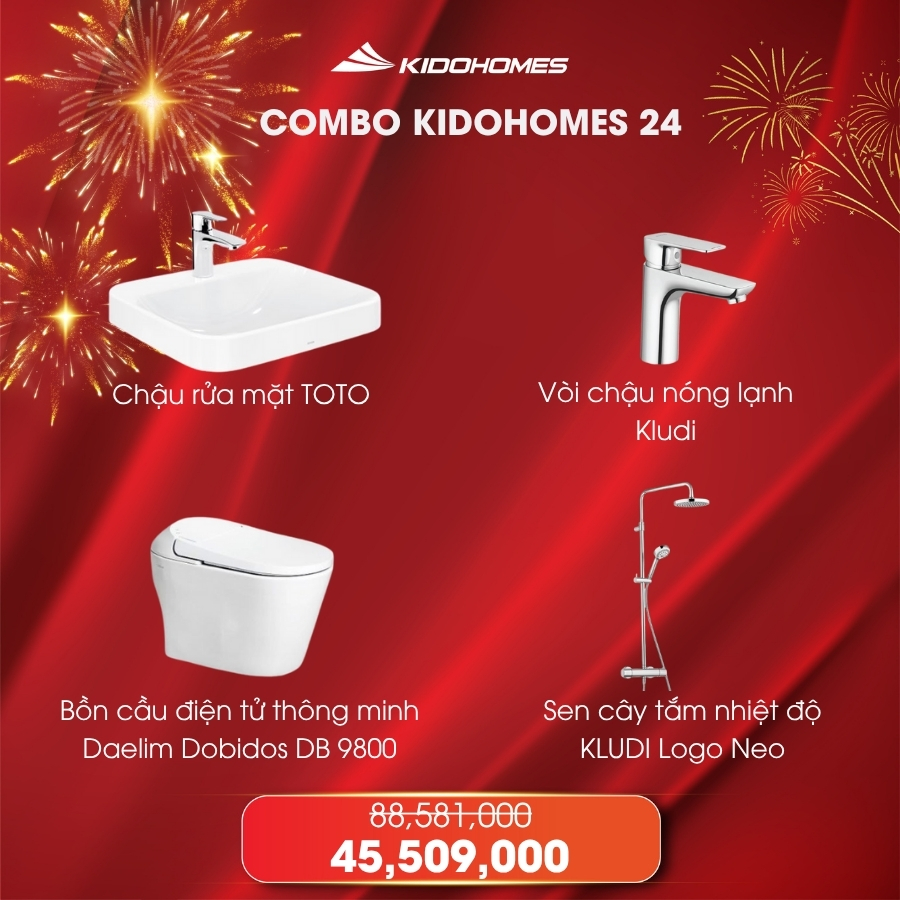 Combo Kidohomes 24 là lựa chọn lý tưởng cho những ai mong muốn sở hữu phòng tắm thông minh, sang trọng và đồng bộ. Sự kết hợp giữa bồn cầu điện tử Daelim Dobidos BD9800, lavabo TOTO, vòi Kludi và sen cây Kludi Logo Neo không chỉ tối ưu công năng mà còn nâng tầm trải nghiệm phòng tắm lên chuẩn đẳng cấp châu Âu.
