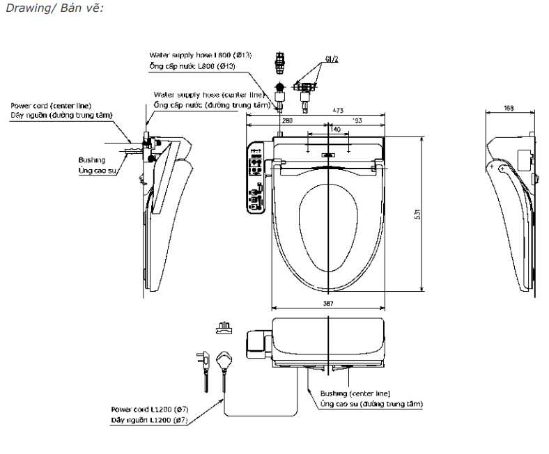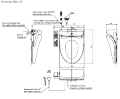 Bản vẽ kỹ thuật nắp rửa điện tử TOTO WASHLET C2 cơ bản TCF23710AAA#NW1 chính hãng