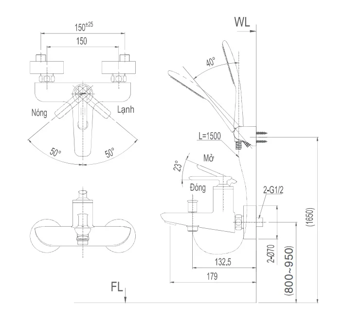 - Áp lực nước : 0.05 MPa ~ 0.75 MPa