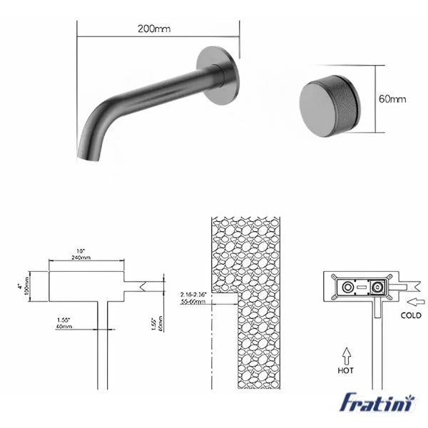 Vòi âm tường nóng lạnh điều chỉnh núm xoay Fratini Venice Grey model 39041612GY