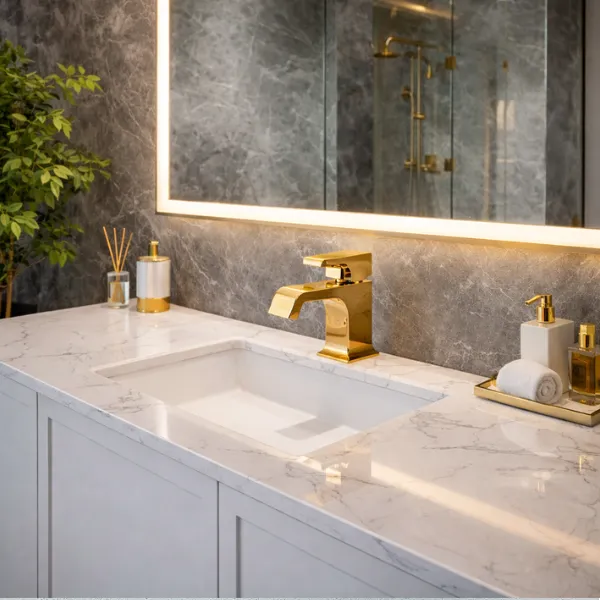 Khi kết hợp cùng lavabo trắng, mặt đá marble hay gương viền kim loại, vòi trở thành điểm nhấn hoàn hảo, không lấn át nhưng đủ sức định hình toàn bộ phong cách.