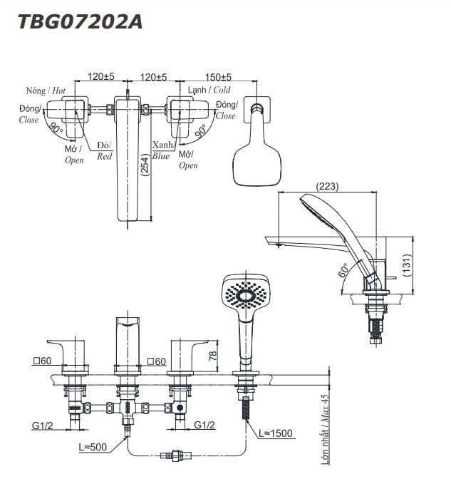 Vòi xả bồn nóng lạnh kèm sen tắm GE TOTO TBG07202A (4 lỗ)