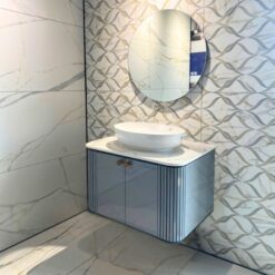- Phong cách tân cổ điển: Sắc xanh Neoclassical Blue tinh tế, kết hợp với bàn đá trắng vân mây, tạo nên điểm nhấn nổi bật, mang đến không gian phòng tắm một vẻ đẹp sang trọng, thanh lịch.
