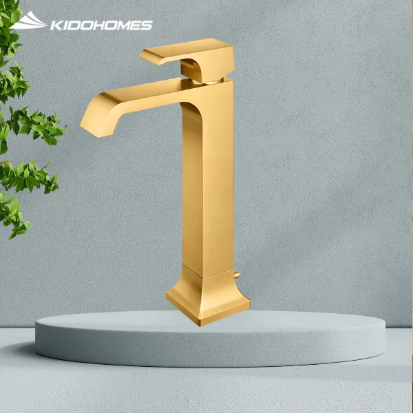 Khi kết hợp với chậu đặt bàn và mặt đá, một chiếc vòi cao màu vàng mờ tạo điểm nhấn rất tinh tế mà vẫn giữ vẻ sang trọng.