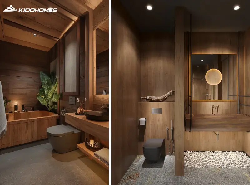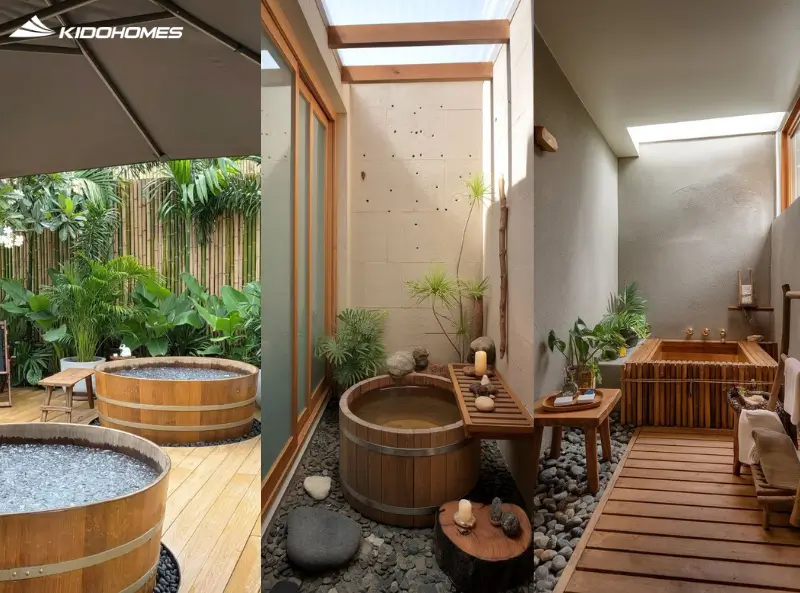 - Gỗ mộc (Unfinished Wood): Gỗ bách (Hinoki) hoặc gỗ sồi không sơn bóng là lựa chọn tuyệt vời. Khả năng chịu ẩm và mùi hương tự nhiên của gỗ khi gặp nước nóng sẽ tạo nên một liệu pháp mùi hương (aromatherapy) tuyệt vời.